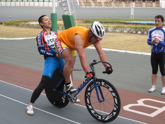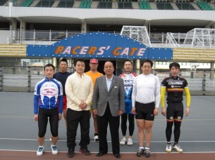 参加には事前の申し込みが必要です。詳細は連盟までお問い合わせください。 ※3月29日に練習会を行いました。50周回のあと1kmTTなど。6名参加。練習後に川井名誉会長を中心に記念撮影。